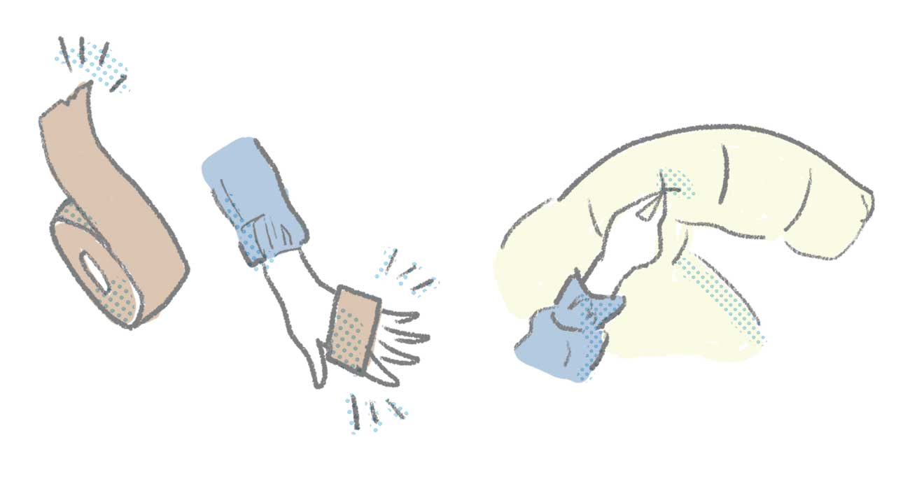 特性上、まれにダウンがわずかに飛び出すことがありますが、保温性やロフトに影響はありませんのでご安心ください。引っぱると他のダウンも出てしまうため、以下の方法で対処してください。