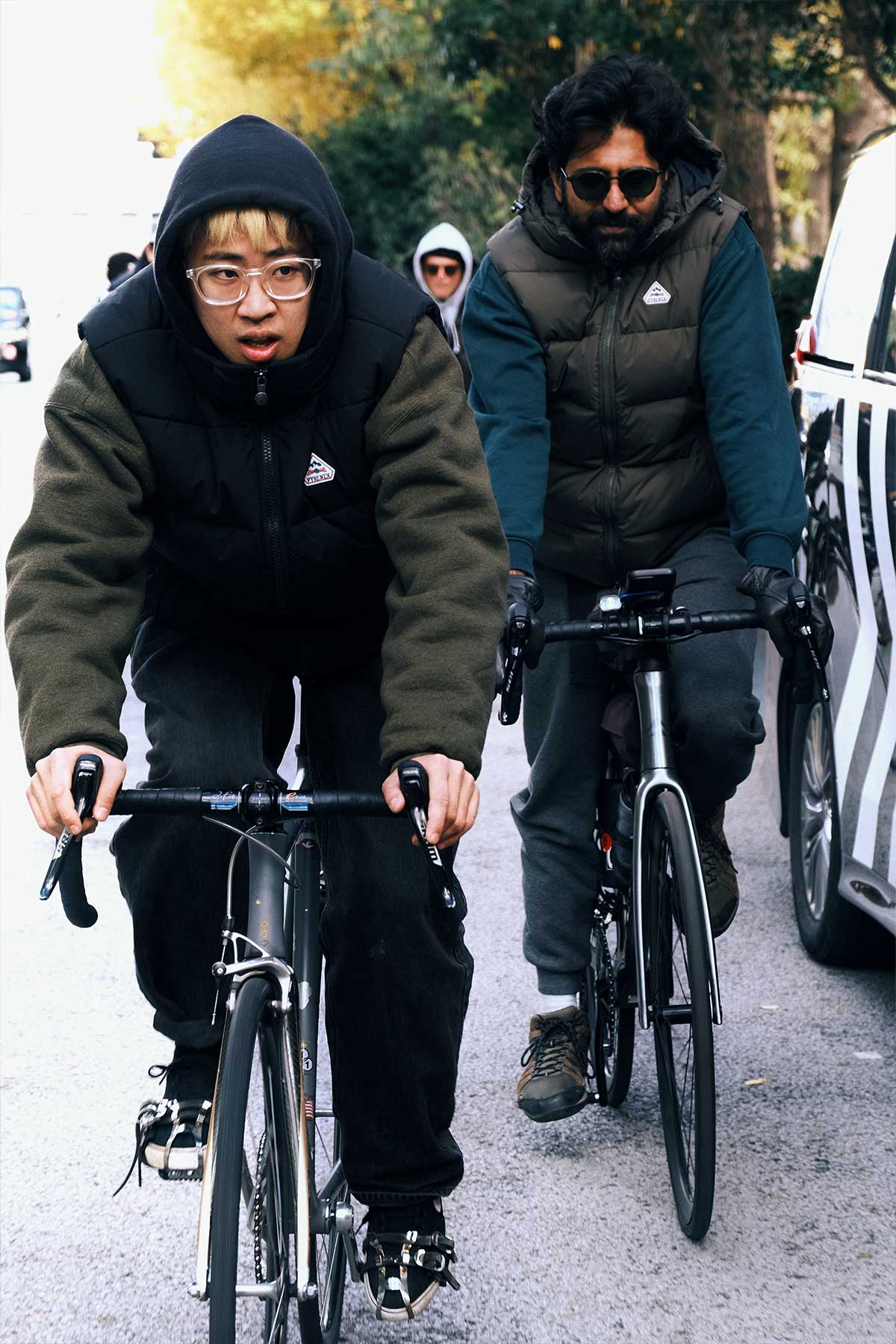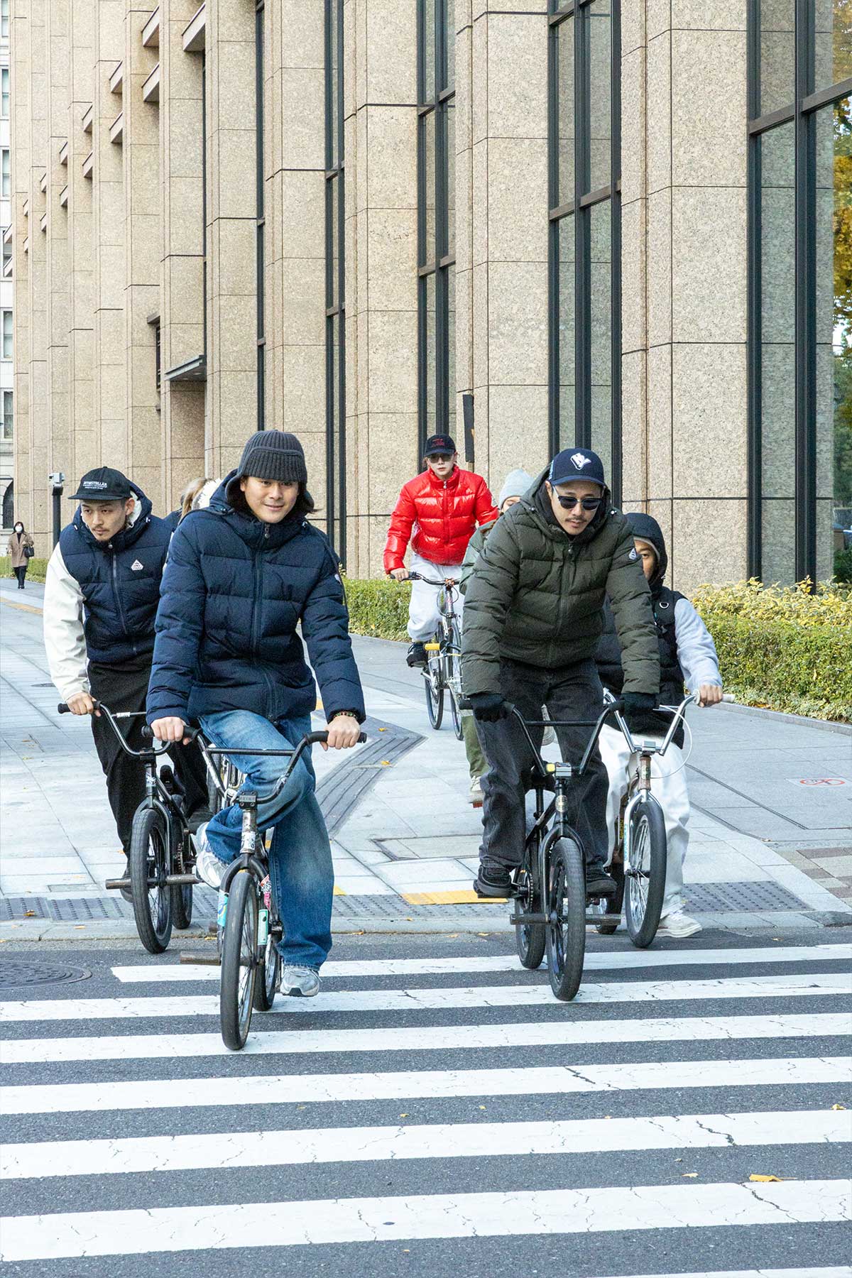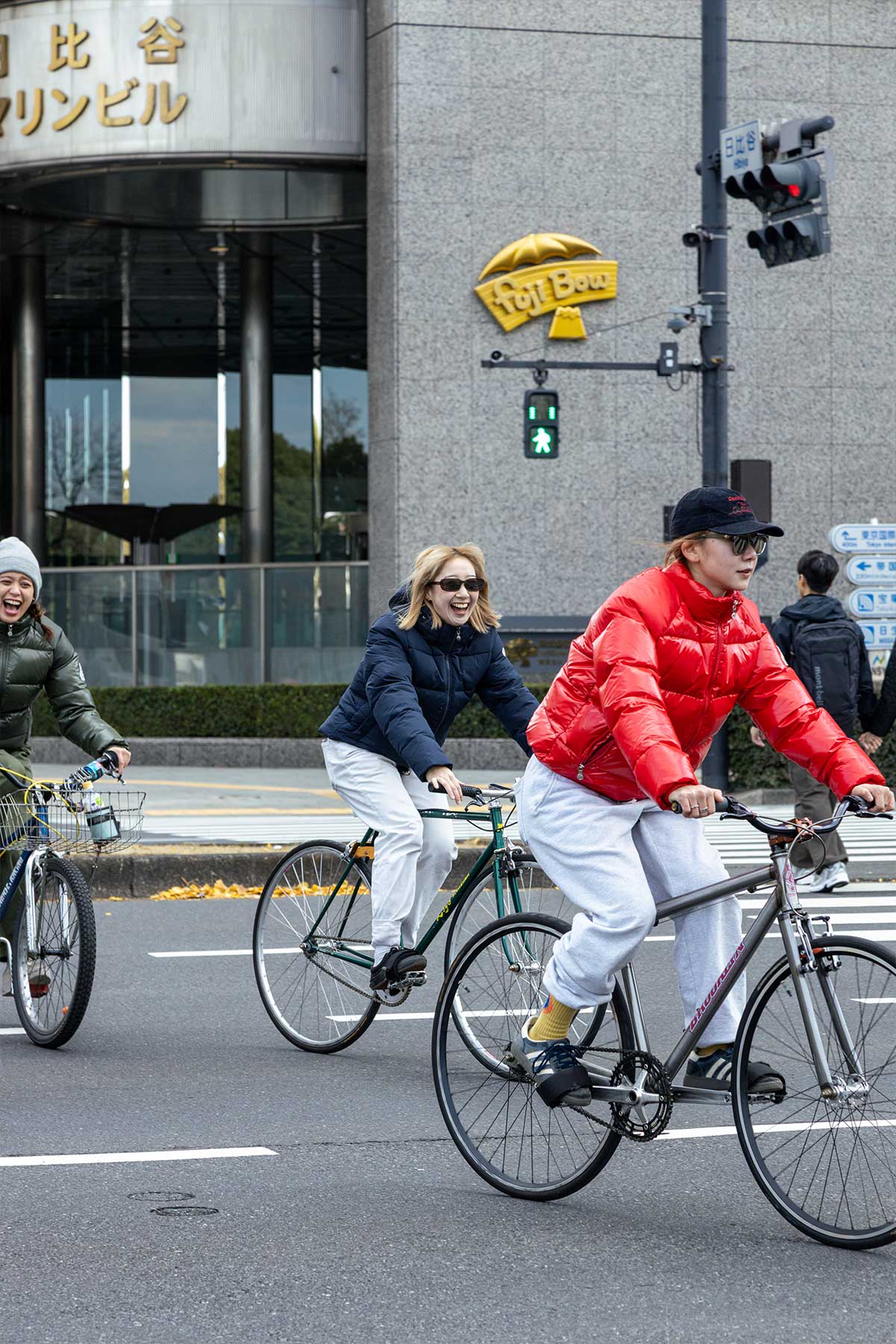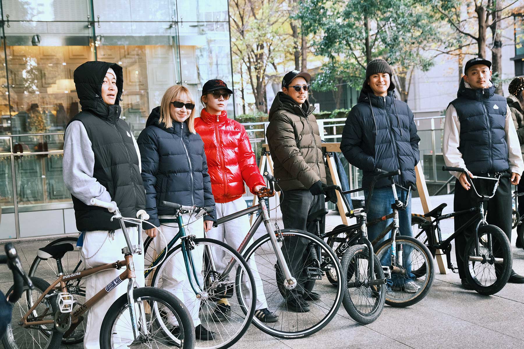 当日は、ロードバイク、マウンテンバイク、BMX など多彩なスタイルを持つ参加者が、PYRENEXのアウターを着用し、東京のさまざまなスポットでフォトセッションを実施。